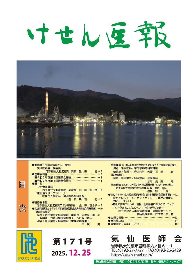 | 連日各地で40度を超える気温が報告され、まさに記録的な猛暑の中、 ご寄稿いただいた先生方に厚く御礼申し上げます。 けせん医報第170号では巻頭言・随想・研修医日記に加え、 特別寄稿として2月から3月にかけて発生した大船渡市大規模林野火災について、 4名の先生方にご寄稿いただきました。 先生方の当時の行動や避難所の状況を会員の皆様で情報共有することは、 今後また災害が起こった際の参考になり、とても有意義であると思いました。 火災があった地区についてはまだ復興の途中であり、引き続き医師会として協力していけたらと思います。 今年の夏はまだまだ暑い日が続きそうですので、会員の皆様におかれましてはくれぐれもご自愛ください。 私も遠藤先生のおっしゃる通り、今できることを精一杯行っていきたいと思います。 (写真:村田プリントサービス提供) |